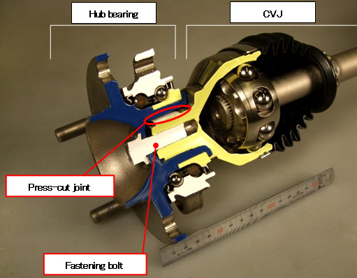 新開(kāi)發(fā)的“壓切花鍵輪轂接頭”大大減輕了重量,并基于NTN作為輪轂軸承和CVJ制造商的高技術(shù)能力開(kāi)發(fā)的新接頭方法提供了更高的性能,輪轂軸承的預(yù)花鍵(較小的花鍵)內(nèi)孔表面采用專(zhuān)有的壓切花鍵接頭,減少了裝配所需的載荷,并配有螺栓將輪轂接頭和CVJ固定在一起。